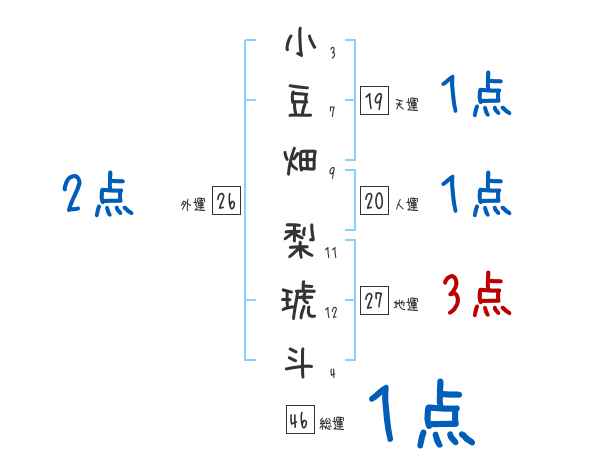 地運![]() | 小豆畑梨琥斗さんの地運は27画の3つ星!頭脳明晰だが強情で摩擦が多い傾向。孤立に注意。 個性を表す基礎的な運勢です。性格形成や対人関係、行動力など家庭環境に影響されます。主に誕生してから20歳くらいまでの若年期の運勢を表します。 |