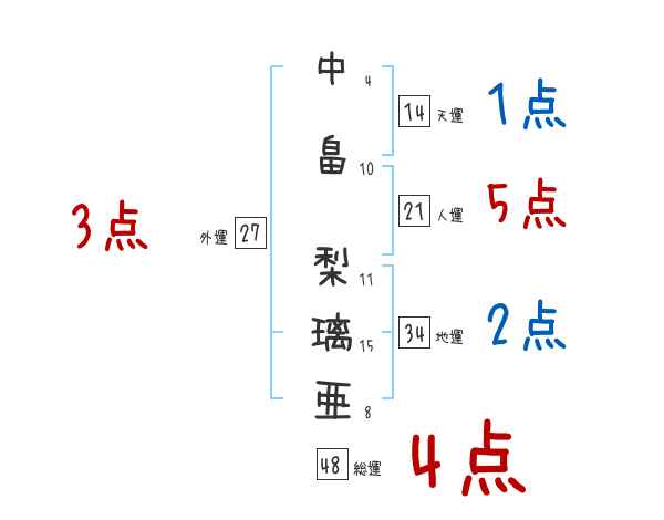 外運![]() | 中畠梨璃亜さんの外運は27画の3つ星!頭脳明晰だが強情で摩擦が多い傾向。孤立に注意。 生活面を象徴する運勢です。外部から受ける影響力を表し、結婚運、家庭運や職場、環境への順応性を表します。 |