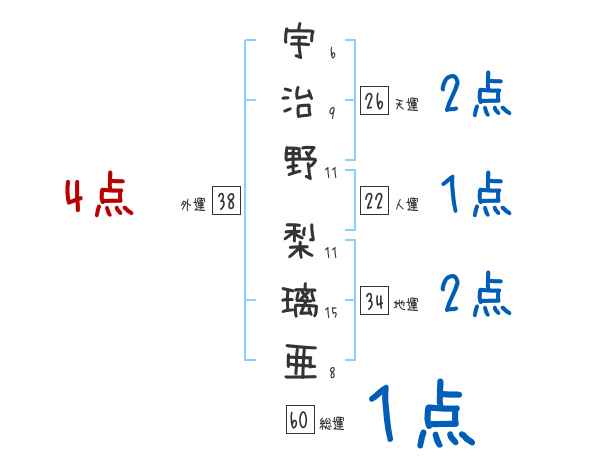 天運![]() | 宇治野梨璃亜さんの天運は26画の2つ星!波瀾万丈かも。信頼できる人を大事にしましょう。 家系が持つ宿命的な運勢を表します。祖先から受け継いだ苗字ですので自分の力が及びません。家柄を象徴します。 |