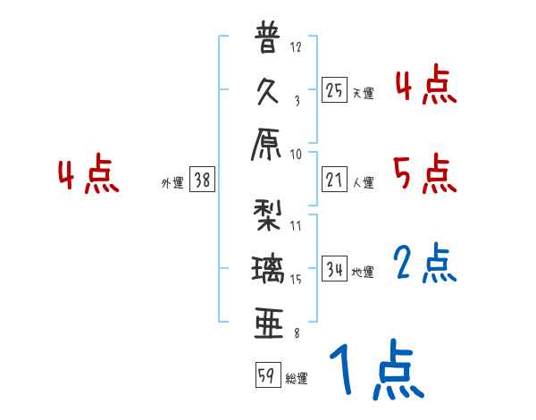 天運![]() | 普久原梨璃亜さんの天運は25画の4つ星!個性があり才能があふれる。強運の持ち主で発展する。 家系が持つ宿命的な運勢を表します。祖先から受け継いだ苗字ですので自分の力が及びません。家柄を象徴します。 |