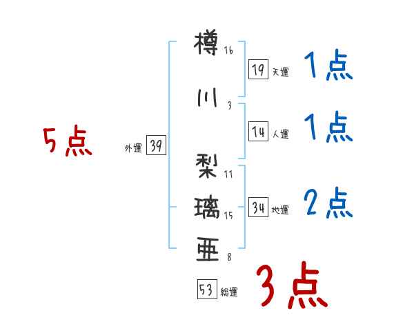 外運![]() | 樽川梨璃亜さんの外運は39画の5つ星!社交性に優れ人望が厚い。人の上に立ち成功する。 生活面を象徴する運勢です。外部から受ける影響力を表し、結婚運、家庭運や職場、環境への順応性を表します。 |