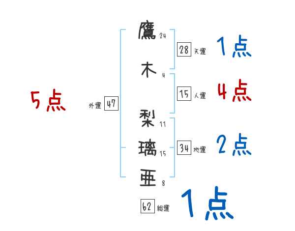 天運![]() | 鷹木梨璃亜さんの天運は28画の1つ星!家庭環境に注意。スポーツで活躍できる能力があるかも。 家系が持つ宿命的な運勢を表します。祖先から受け継いだ苗字ですので自分の力が及びません。家柄を象徴します。 |