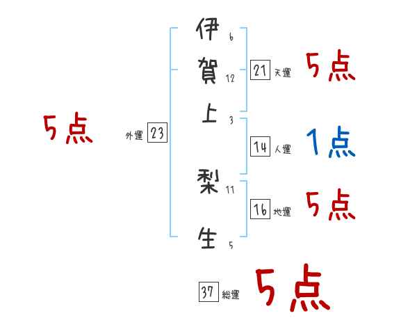 外運![]() | 伊賀上梨生さんの外運は23画の5つ星!想像力に優れ活力がある。一代で成功し名誉を手に入れる。 生活面を象徴する運勢です。外部から受ける影響力を表し、結婚運、家庭運や職場、環境への順応性を表します。 |