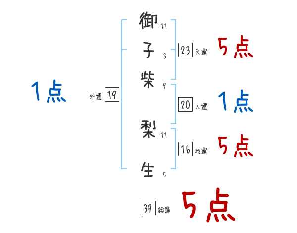地運![]() | 御子柴梨生さんの地運は16画の5つ星!人望が厚く大きく発展する。逆転成功が見える。 個性を表す基礎的な運勢です。性格形成や対人関係、行動力など家庭環境に影響されます。主に誕生してから20歳くらいまでの若年期の運勢を表します。 |