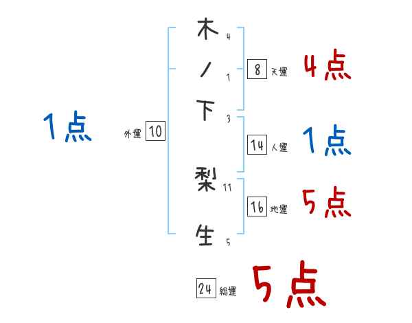 天運![]() | 木ノ下梨生さんの天運は8画の4つ星!勤勉家。根気強く努力し成功する。忍耐力がある。 家系が持つ宿命的な運勢を表します。祖先から受け継いだ苗字ですので自分の力が及びません。家柄を象徴します。 |