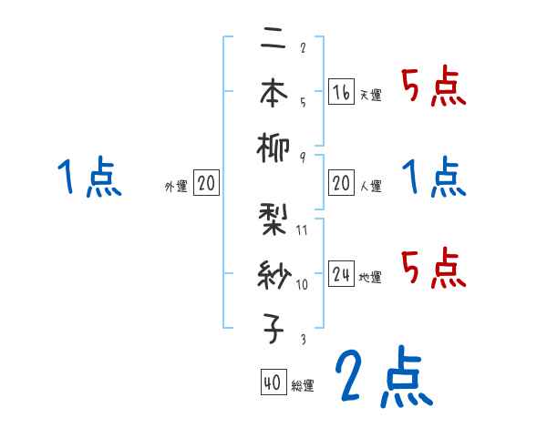 天運![]() | 二本柳梨紗子さんの天運は16画の5つ星!人望が厚く大きく発展する。逆転成功が見える。 家系が持つ宿命的な運勢を表します。祖先から受け継いだ苗字ですので自分の力が及びません。家柄を象徴します。 |