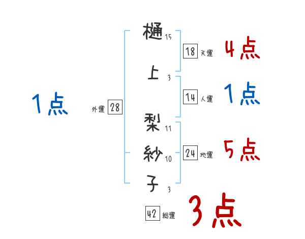 天運![]() | 樋上梨紗子さんの天運は18画の4つ星!情熱的で剛気。忍耐力があり信頼される。 家系が持つ宿命的な運勢を表します。祖先から受け継いだ苗字ですので自分の力が及びません。家柄を象徴します。 |
