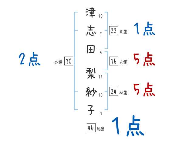 人運![]() | 津志田梨紗子さんの人運は16画の5つ星!人望が厚く大きく発展する。逆転成功が見える。 性格や才能などを表す2番目に重要な運勢です。人間関係や協調性、社会的な成功に影響します。主に20歳から50歳ぐらいまでの中年期の運勢を表します。 |