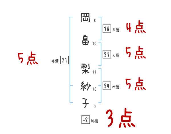 外運![]() | 岡畠梨紗子さんの外運は21画の5つ星!統率力がある。独立し成功する。名誉を手に入れる。 生活面を象徴する運勢です。外部から受ける影響力を表し、結婚運、家庭運や職場、環境への順応性を表します。 |