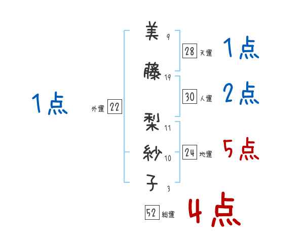 天運![]() | 美藤梨紗子さんの天運は28画の1つ星!家庭環境に注意。スポーツで活躍できる能力があるかも。 家系が持つ宿命的な運勢を表します。祖先から受け継いだ苗字ですので自分の力が及びません。家柄を象徴します。 |