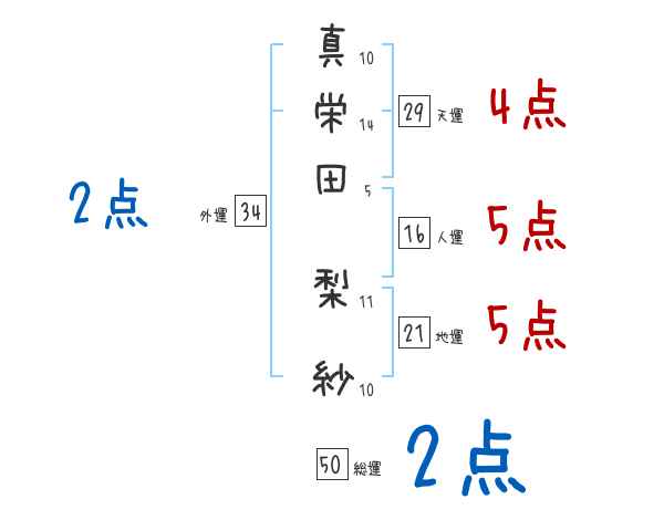 人運![]() | 真栄田梨紗さんの人運は16画の5つ星!人望が厚く大きく発展する。逆転成功が見える。 性格や才能などを表す2番目に重要な運勢です。人間関係や協調性、社会的な成功に影響します。主に20歳から50歳ぐらいまでの中年期の運勢を表します。 |
