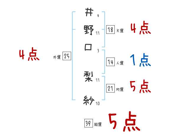 総運![]() | 井野口梨紗さんの総運は39画の5つ星!社交性に優れ人望が厚い。人の上に立ち成功する。 あなたの人生を表す1番重要な運勢です。生涯を通じて影響する総合運となり、主に50歳以降の晩年期に影響を及ぼします。 |