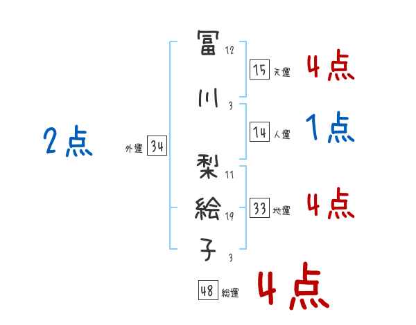天運![]() | 冨川梨絵子さんの天運は15画の4つ星!人徳があり出世する。順調に物事を進め円満な人生。 家系が持つ宿命的な運勢を表します。祖先から受け継いだ苗字ですので自分の力が及びません。家柄を象徴します。 |