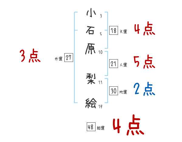人運![]() | 小石原梨絵さんの人運は21画の5つ星!統率力がある。独立し成功する。名誉を手に入れる。 性格や才能などを表す2番目に重要な運勢です。人間関係や協調性、社会的な成功に影響します。主に20歳から50歳ぐらいまでの中年期の運勢を表します。 |