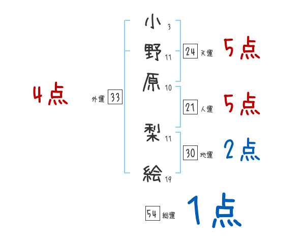外運![]() | 小野原梨絵さんの外運は33画の4つ星!権力志向でプライドが高い。勇気があり運を切り開き成功する。 生活面を象徴する運勢です。外部から受ける影響力を表し、結婚運、家庭運や職場、環境への順応性を表します。 |