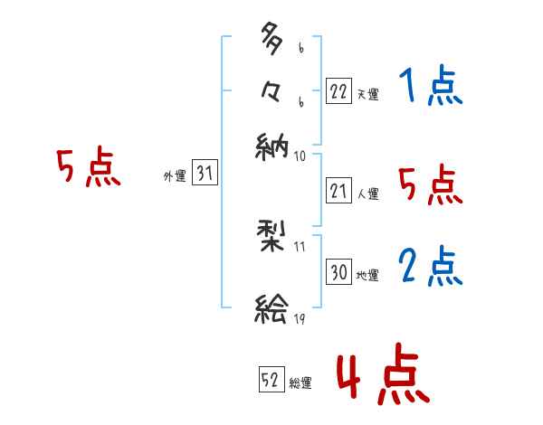 天運![]() | 多々納梨絵さんの天運は22画の1つ星!努力することが苦手ないっぽう手先が器用。芸術性にも優れる。 家系が持つ宿命的な運勢を表します。祖先から受け継いだ苗字ですので自分の力が及びません。家柄を象徴します。 |