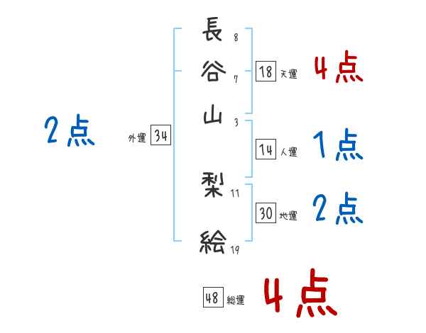 天運![]() | 長谷山梨絵さんの天運は18画の4つ星!情熱的で剛気。忍耐力があり信頼される。 家系が持つ宿命的な運勢を表します。祖先から受け継いだ苗字ですので自分の力が及びません。家柄を象徴します。 |