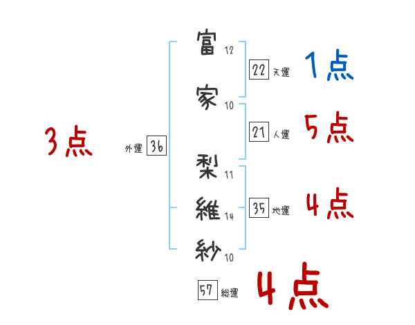 外運![]() | 富家梨維紗さんの外運は36画の3つ星!先見性が豊かです。多少神経質で苦労することも。 生活面を象徴する運勢です。外部から受ける影響力を表し、結婚運、家庭運や職場、環境への順応性を表します。 |