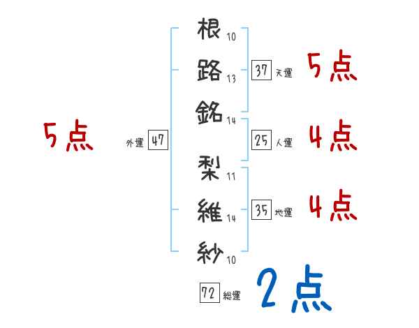 総運![]() | 根路銘梨維紗さんの総運は72画の2つ星!災難が多く不安定な生活にならないように注意。明暗のある人生かも。 あなたの人生を表す1番重要な運勢です。生涯を通じて影響する総合運となり、主に50歳以降の晩年期に影響を及ぼします。 |