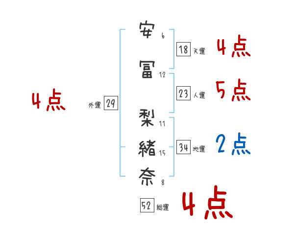 天運![]() | 安冨梨緒奈さんの天運は18画の4つ星!情熱的で剛気。忍耐力があり信頼される。 家系が持つ宿命的な運勢を表します。祖先から受け継いだ苗字ですので自分の力が及びません。家柄を象徴します。 |