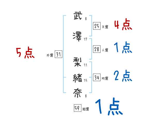 天運![]() | 武澤梨緒奈さんの天運は25画の4つ星!個性があり才能があふれる。強運の持ち主で発展する。 家系が持つ宿命的な運勢を表します。祖先から受け継いだ苗字ですので自分の力が及びません。家柄を象徴します。 |