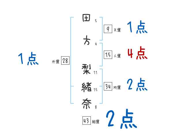 外運![]() | 田方梨緒奈さんの外運は28画の1つ星!家庭環境に注意。スポーツで活躍できる能力があるかも。 生活面を象徴する運勢です。外部から受ける影響力を表し、結婚運、家庭運や職場、環境への順応性を表します。 |