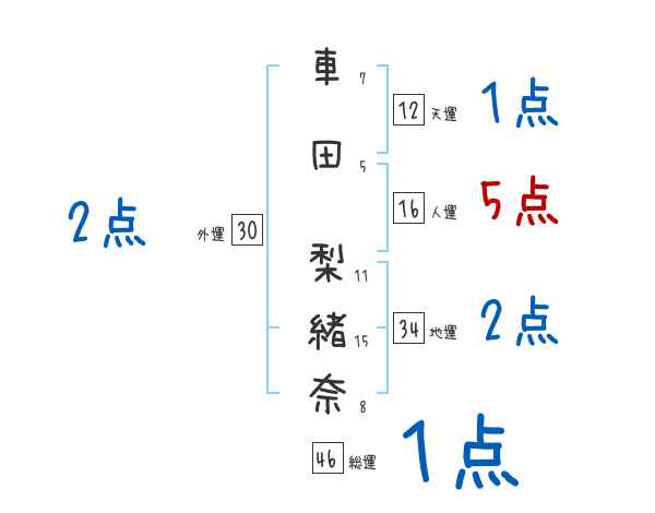 外運![]() | 車田梨緒奈さんの外運は30画の2つ星!浮き沈みの激しさに注意しましょう。 生活面を象徴する運勢です。外部から受ける影響力を表し、結婚運、家庭運や職場、環境への順応性を表します。 |