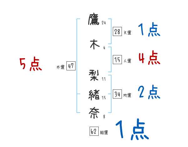 外運![]() | 鷹木梨緒奈さんの外運は47画の5つ星!実力が開花し発展する円満な人生。財に恵まれる。 生活面を象徴する運勢です。外部から受ける影響力を表し、結婚運、家庭運や職場、環境への順応性を表します。 |