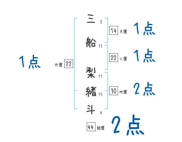 外運![]() | 三船梨緒斗さんの外運は22画の1つ星!努力することが苦手ないっぽう手先が器用。芸術性にも優れる。 生活面を象徴する運勢です。外部から受ける影響力を表し、結婚運、家庭運や職場、環境への順応性を表します。 |