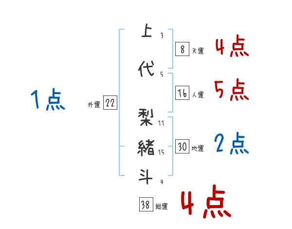 人運![]() | 上代梨緒斗さんの人運は16画の5つ星!人望が厚く大きく発展する。逆転成功が見える。 性格や才能などを表す2番目に重要な運勢です。人間関係や協調性、社会的な成功に影響します。主に20歳から50歳ぐらいまでの中年期の運勢を表します。 |