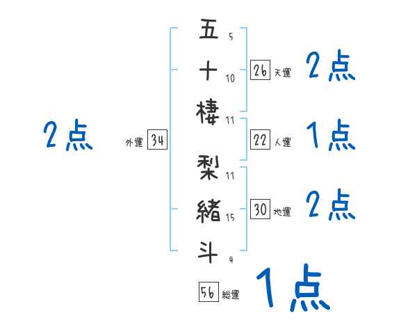 総運![]() | 五十棲梨緒斗さんの総運は56画の1つ星!消極的で無気力になりがち。誠実な気持ちが必要でしょう。 あなたの人生を表す1番重要な運勢です。生涯を通じて影響する総合運となり、主に50歳以降の晩年期に影響を及ぼします。 |