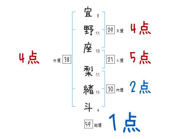総運![]() | 宜野座梨緒斗さんの総運は59画の1つ星!意志の弱さであきらめることが多いかも。粘り強さが必要。 あなたの人生を表す1番重要な運勢です。生涯を通じて影響する総合運となり、主に50歳以降の晩年期に影響を及ぼします。 |