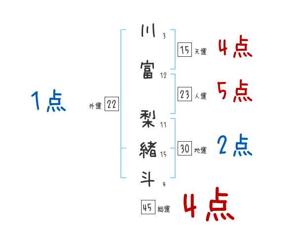 天運![]() | 川富梨緒斗さんの天運は15画の4つ星!人徳があり出世する。順調に物事を進め円満な人生。 家系が持つ宿命的な運勢を表します。祖先から受け継いだ苗字ですので自分の力が及びません。家柄を象徴します。 |