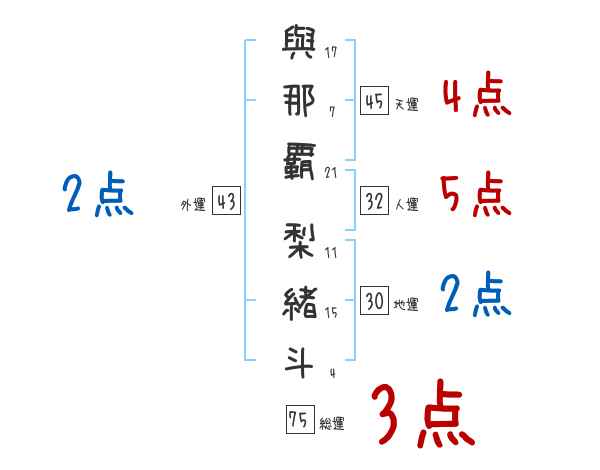 人運![]() | 與那覇梨緒斗さんの人運は32画の5つ星!柔軟性があり成功する。チャンスが多く金運が良い。 性格や才能などを表す2番目に重要な運勢です。人間関係や協調性、社会的な成功に影響します。主に20歳から50歳ぐらいまでの中年期の運勢を表します。 |
