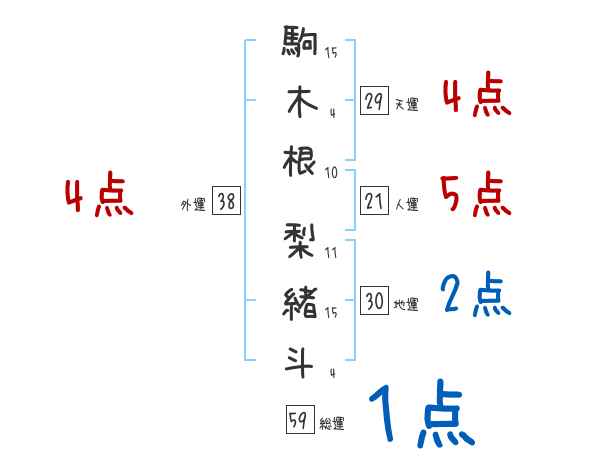 総運![]() | 駒木根梨緒斗さんの総運は59画の1つ星!意志の弱さであきらめることが多いかも。粘り強さが必要。 あなたの人生を表す1番重要な運勢です。生涯を通じて影響する総合運となり、主に50歳以降の晩年期に影響を及ぼします。 |