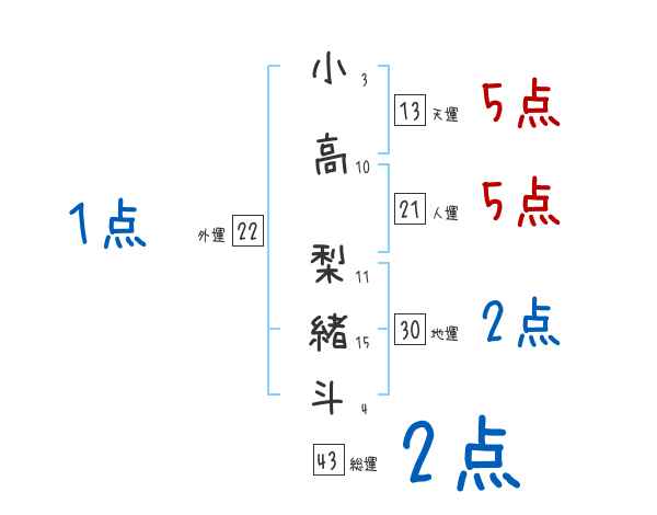 総運![]() | 小高梨緒斗さんの総運は43画の2つ星!頑固な性格で独立心が強いかも。やや非現実的で浪費に注意しましょう。 あなたの人生を表す1番重要な運勢です。生涯を通じて影響する総合運となり、主に50歳以降の晩年期に影響を及ぼします。 |