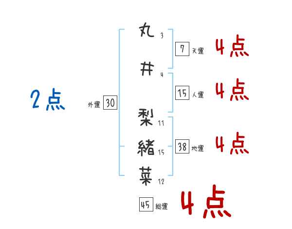 総運![]() | 丸井梨緒菜さんの総運は45画の4つ星!もくもくと物事を進め達成する。地味な努力家。 あなたの人生を表す1番重要な運勢です。生涯を通じて影響する総合運となり、主に50歳以降の晩年期に影響を及ぼします。 |
