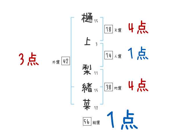 外運![]() | 樋上梨緒菜さんの外運は42画の3つ星!病気に注意。多芸であるが消極的でおとなしい。 生活面を象徴する運勢です。外部から受ける影響力を表し、結婚運、家庭運や職場、環境への順応性を表します。 |