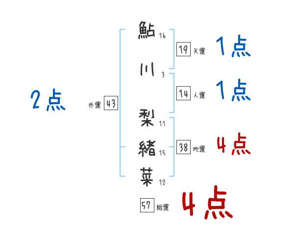 総運![]() | 鮎川梨緒菜さんの総運は57画の4つ星!向上心があり人望がある。地位を得る。 あなたの人生を表す1番重要な運勢です。生涯を通じて影響する総合運となり、主に50歳以降の晩年期に影響を及ぼします。 |