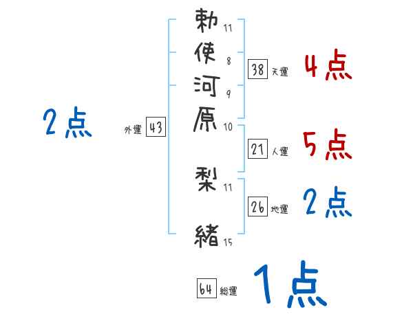 天運![]() | 勅使河原梨緒さんの天運は38画の4つ星!温厚な性格で技術的な才能を発揮する。職人的な仕事に向いている。 家系が持つ宿命的な運勢を表します。祖先から受け継いだ苗字ですので自分の力が及びません。家柄を象徴します。 |