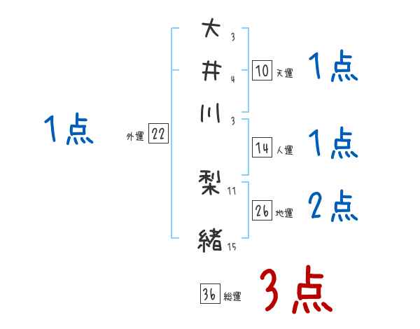 総運![]() | 大井川梨緒さんの総運は36画の3つ星!先見性が豊かです。多少神経質で苦労することも。 あなたの人生を表す1番重要な運勢です。生涯を通じて影響する総合運となり、主に50歳以降の晩年期に影響を及ぼします。 |