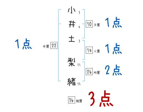 総運![]() | 小井土梨緒さんの総運は36画の3つ星!先見性が豊かです。多少神経質で苦労することも。 あなたの人生を表す1番重要な運勢です。生涯を通じて影響する総合運となり、主に50歳以降の晩年期に影響を及ぼします。 |