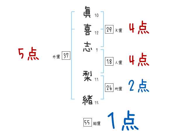 外運![]() | 眞喜志梨緒さんの外運は37画の5つ星!努力家で順応性に優れる。現実的な考え方ができ忠実に物事をこなす。 生活面を象徴する運勢です。外部から受ける影響力を表し、結婚運、家庭運や職場、環境への順応性を表します。 |