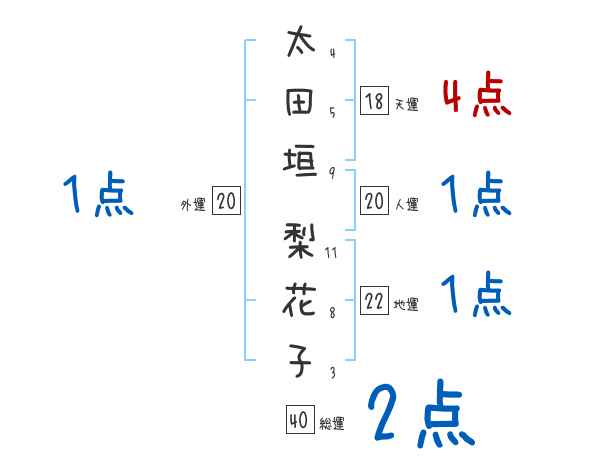 天運![]() | 太田垣梨花子さんの天運は18画の4つ星!情熱的で剛気。忍耐力があり信頼される。 家系が持つ宿命的な運勢を表します。祖先から受け継いだ苗字ですので自分の力が及びません。家柄を象徴します。 |