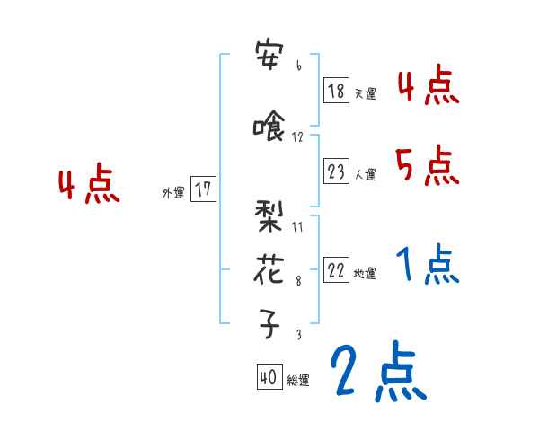 天運![]() | 安喰梨花子さんの天運は18画の4つ星!情熱的で剛気。忍耐力があり信頼される。 家系が持つ宿命的な運勢を表します。祖先から受け継いだ苗字ですので自分の力が及びません。家柄を象徴します。 |