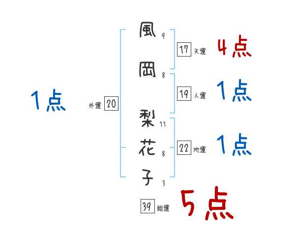 総運![]() | 風岡梨花子さんの総運は39画の5つ星!社交性に優れ人望が厚い。人の上に立ち成功する。 あなたの人生を表す1番重要な運勢です。生涯を通じて影響する総合運となり、主に50歳以降の晩年期に影響を及ぼします。 |