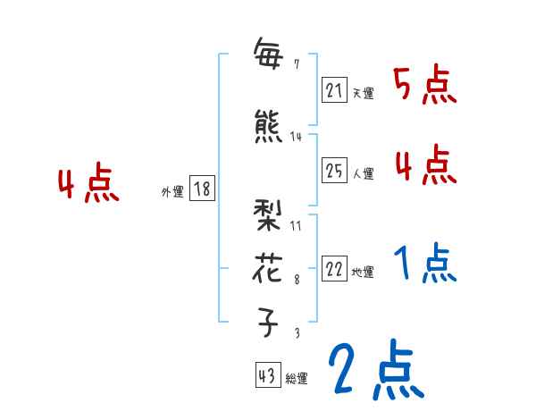 天運![]() | 毎熊梨花子さんの天運は21画の5つ星!統率力がある。独立し成功する。名誉を手に入れる。 家系が持つ宿命的な運勢を表します。祖先から受け継いだ苗字ですので自分の力が及びません。家柄を象徴します。 |