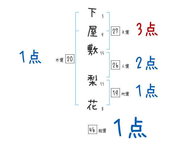 天運![]() | 下屋敷梨花さんの天運は27画の3つ星!頭脳明晰だが強情で摩擦が多い傾向。孤立に注意。 家系が持つ宿命的な運勢を表します。祖先から受け継いだ苗字ですので自分の力が及びません。家柄を象徴します。 |