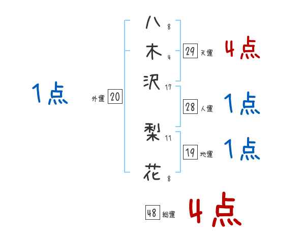 天運![]() | 八木沢梨花さんの天運は29画の4つ星!完全主義で才能がある。厳格な心の持ち主。 家系が持つ宿命的な運勢を表します。祖先から受け継いだ苗字ですので自分の力が及びません。家柄を象徴します。 |