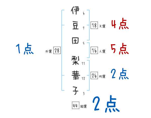 天運![]() | 伊豆田梨華子さんの天運は18画の4つ星!情熱的で剛気。忍耐力があり信頼される。 家系が持つ宿命的な運勢を表します。祖先から受け継いだ苗字ですので自分の力が及びません。家柄を象徴します。 |